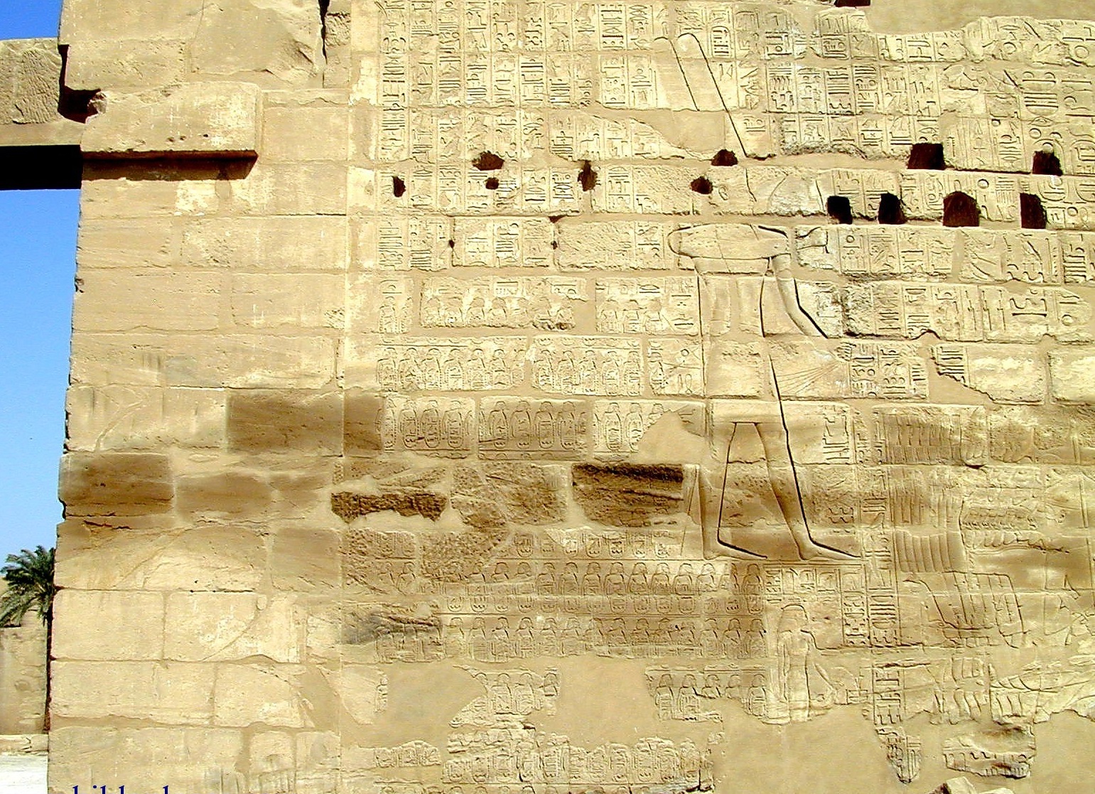 上图:古埃及第二十二王朝首位法老舍顺克一世(Shoshenq I,主前943–922年)的凯旋浮雕,位于卡纳克神庙(Temple of Karnak)的Bubastite Portal大门上。浮雕上描绘了舍顺克一世的迦南战役,上面列出了所占领的以色列和犹大的城镇,如伯·珊、伯·和仑、米吉多、亚拉得等等。考古学家普遍认为舍顺克一世就是埃及王示撒。
