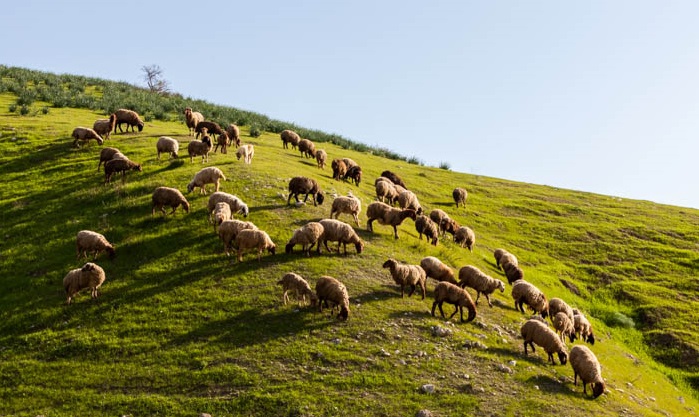 上图:一群羊在Qelt旱溪(Wadi Qelt,or Nahal Prat?)喝水。以色列的绵羊在雨季放牧在雨水滋润的草地上,旱季则吃杂草和田中收割剩下的残茬。在雨季,绵羊从嫩草中获得水分,可以几周不喝水;但在旱季,成年的绵羊每天需要喝4-12升水。山羊能独立找水,但会迷路,而绵羊则完全倚靠牧人寻觅水草。